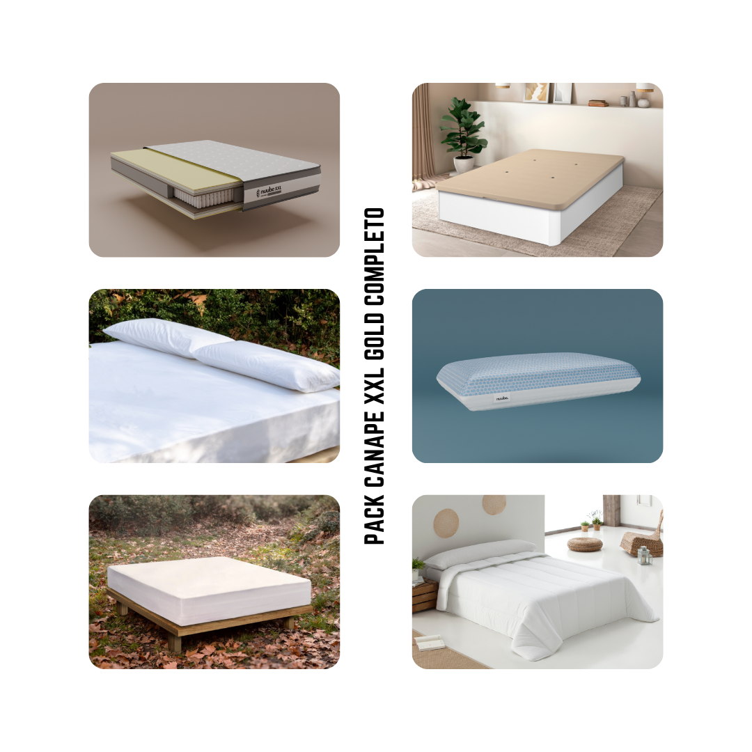 El Pack Gold XXL Completo incluye todo lo que necesitas para un descanso de lujo: colchón Nuube XXL, canapé Gold con gran capacidad, dos (O UNA SEGUN MEDIDA) almohadas Antidolor, protectores Sensación para colchón y almohadas, y edredón nórdico Micro 300 gr. Un conjunto premium, pensado para ofrecerte confort, higiene y bienestar desde la primera noche
