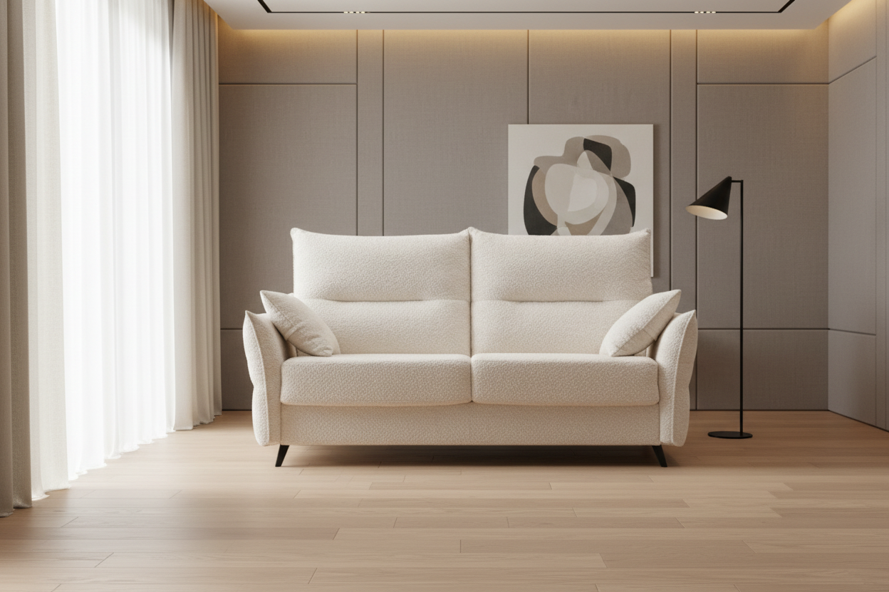 La estructura del sofá combina madera de pino y tableros de partículas reforzados, lo que le da estabilidad y resistencia a largo plazo.